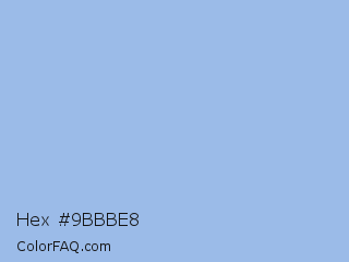 Hex #9bbbe8 Color is a light blue color and the nearest color is Pale Cerulean #9bc4e2. Hex code #9bbbe8 and RGB value is rgb(155,187,232). In RGB color space, this color is composed of 61% red, 73% green, 91% blue, In CMYK color space, this color is composed of 33% cyan, 19% magenta, 0% yellow , 9% black , In HSL color space, this color has a hue angle of 215° , 63% saturation and 76% lightness.