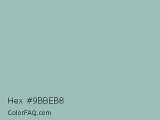 Hex #9bbeb8 Color is a light cyan color and the nearest color is Shadow Green #9ac2b8. Hex code #9bbeb8 and RGB value is rgb(155,190,184). In RGB color space, this color is composed of 61% red, 75% green, 72% blue, In CMYK color space, this color is composed of 18% cyan, 0% magenta, 3% yellow , 25% black , In HSL color space, this color has a hue angle of 170° , 21% saturation and 68% lightness.