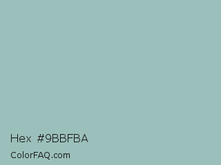 Hex #9bbfba Color is a light cyan color and the nearest color is Shadow Green #9ac2b8. Hex code #9bbfba and RGB value is rgb(155,191,186). In RGB color space, this color is composed of 61% red, 75% green, 73% blue, In CMYK color space, this color is composed of 19% cyan, 0% magenta, 3% yellow , 25% black , In HSL color space, this color has a hue angle of 172° , 22% saturation and 68% lightness.