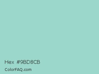 Hex #9bd8cb Color is a light cyan color and the nearest color is Sinbad #9fd7d3. Hex code #9bd8cb and RGB value is rgb(155,216,203). In RGB color space, this color is composed of 61% red, 85% green, 80% blue, In CMYK color space, this color is composed of 28% cyan, 0% magenta, 6% yellow , 15% black , In HSL color space, this color has a hue angle of 167° , 44% saturation and 73% lightness.