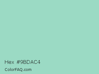 Hex #9bdac4 Color is a light green color and the nearest color is Sea Foam Green #9fe2bf. Hex code #9bdac4 and RGB value is rgb(155,218,196). In RGB color space, this color is composed of 61% red, 85% green, 77% blue, In CMYK color space, this color is composed of 29% cyan, 0% magenta, 10% yellow , 15% black , In HSL color space, this color has a hue angle of 159° , 46% saturation and 73% lightness.