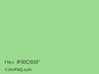 Hex #9bdb8f Color is a light green color and the nearest color is Feijoa #9fdd8c. Hex code #9bdb8f and RGB value is rgb(155,219,143). In RGB color space, this color is composed of 61% red, 86% green, 56% blue, In CMYK color space, this color is composed of 29% cyan, 0% magenta, 35% yellow , 14% black , In HSL color space, this color has a hue angle of 111° , 51% saturation and 71% lightness.