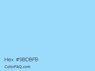 Hex #9bdbfb Color is a light blue color and the nearest color is Anakiwa #9de5ff. Hex code #9bdbfb and RGB value is rgb(155,219,251). In RGB color space, this color is composed of 61% red, 86% green, 98% blue, In CMYK color space, this color is composed of 38% cyan, 13% magenta, 0% yellow , 2% black , In HSL color space, this color has a hue angle of 200° , 92% saturation and 80% lightness.