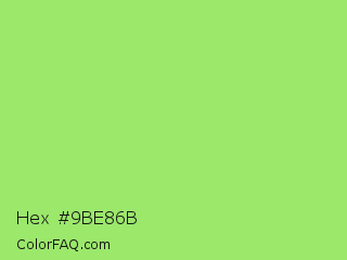 Hex #9be86b Color is a light green color and the nearest color is Inchworm #b2ec5d. Hex code #9be86b and RGB value is rgb(155,232,107). In RGB color space, this color is composed of 61% red, 91% green, 42% blue, In CMYK color space, this color is composed of 33% cyan, 0% magenta, 54% yellow , 9% black , In HSL color space, this color has a hue angle of 97° , 73% saturation and 66% lightness.