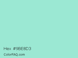 Hex #9be8d3 Color is a light cyan color and the nearest color is Pale Robin Egg Blue #96ded1. Hex code #9be8d3 and RGB value is rgb(155,232,211). In RGB color space, this color is composed of 61% red, 91% green, 83% blue, In CMYK color space, this color is composed of 33% cyan, 0% magenta, 9% yellow , 9% black , In HSL color space, this color has a hue angle of 164° , 63% saturation and 76% lightness.