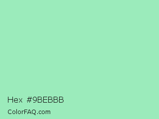 Hex #9bebbb Color is a light green color and the nearest color is Teal Deer #99e6b3. Hex code #9bebbb and RGB value is rgb(155,235,187). In RGB color space, this color is composed of 61% red, 92% green, 73% blue, In CMYK color space, this color is composed of 34% cyan, 0% magenta, 20% yellow , 8% black , In HSL color space, this color has a hue angle of 144° , 67% saturation and 76% lightness.