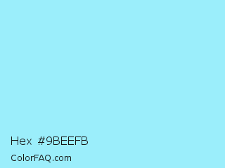 Hex #9beefb Color is a light cyan color and the nearest color is Anakiwa #9de5ff. Hex code #9beefb and RGB value is rgb(155,238,251). In RGB color space, this color is composed of 61% red, 93% green, 98% blue, In CMYK color space, this color is composed of 38% cyan, 5% magenta, 0% yellow , 2% black , In HSL color space, this color has a hue angle of 188° , 92% saturation and 80% lightness.