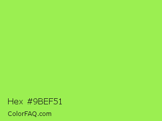 Hex #9bef51 Color is a light green color and the nearest color is Kiwi #8ee53f. Hex code #9bef51 and RGB value is rgb(155,239,81). In RGB color space, this color is composed of 61% red, 94% green, 32% blue, In CMYK color space, this color is composed of 35% cyan, 0% magenta, 66% yellow , 6% black , In HSL color space, this color has a hue angle of 92° , 83% saturation and 63% lightness.