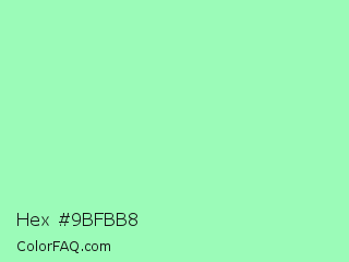 Hex #9bfbb8 Color is a light green color and the nearest color is Teal Deer #99e6b3. Hex code #9bfbb8 and RGB value is rgb(155,251,184). In RGB color space, this color is composed of 61% red, 98% green, 72% blue, In CMYK color space, this color is composed of 38% cyan, 0% magenta, 27% yellow , 2% black , In HSL color space, this color has a hue angle of 138° , 92% saturation and 80% lightness.