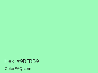 Hex #9bfbb9 Color is a light green color and the nearest color is Teal Deer #99e6b3. Hex code #9bfbb9 and RGB value is rgb(155,251,185). In RGB color space, this color is composed of 61% red, 98% green, 73% blue, In CMYK color space, this color is composed of 38% cyan, 0% magenta, 26% yellow , 2% black , In HSL color space, this color has a hue angle of 139° , 92% saturation and 80% lightness.
