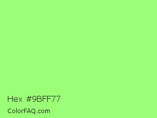 Hex #9bff77 Color is a light green color and the nearest color is Light Green #90ee90. Hex code #9bff77 and RGB value is rgb(155,255,119). In RGB color space, this color is composed of 61% red, 100% green, 47% blue, In CMYK color space, this color is composed of 39% cyan, 0% magenta, 53% yellow , 0% black , In HSL color space, this color has a hue angle of 104° , 100% saturation and 73% lightness.