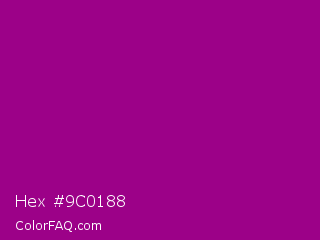 Hex #9c0188 Color is a normal magenta color and the nearest color is Dark Magenta #8b008b. Hex code #9c0188 and RGB value is rgb(156,1,136). In RGB color space, this color is composed of 61% red, 0% green, 53% blue, In CMYK color space, this color is composed of 0% cyan, 99% magenta, 13% yellow , 39% black , In HSL color space, this color has a hue angle of 308° , 99% saturation and 31% lightness.