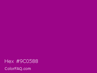 Hex #9c0588 Color is a normal magenta color and the nearest color is Dark Magenta #8b008b. Hex code #9c0588 and RGB value is rgb(156,5,136). In RGB color space, this color is composed of 61% red, 2% green, 53% blue, In CMYK color space, this color is composed of 0% cyan, 97% magenta, 13% yellow , 39% black , In HSL color space, this color has a hue angle of 308° , 94% saturation and 32% lightness.