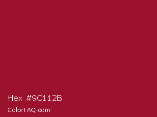 Hex #9c112b Color is a normal red color and the nearest color is Ruby Red #9b111e. Hex code #9c112b and RGB value is rgb(156,17,43). In RGB color space, this color is composed of 61% red, 7% green, 17% blue, In CMYK color space, this color is composed of 0% cyan, 89% magenta, 72% yellow , 39% black , In HSL color space, this color has a hue angle of 349° , 80% saturation and 34% lightness.