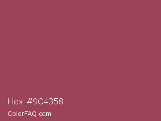 Hex #9c4358 Color is a normal red color and the nearest color is Vin Rouge #983d61. Hex code #9c4358 and RGB value is rgb(156,67,88). In RGB color space, this color is composed of 61% red, 26% green, 35% blue, In CMYK color space, this color is composed of 0% cyan, 57% magenta, 44% yellow , 39% black , In HSL color space, this color has a hue angle of 346° , 40% saturation and 44% lightness.