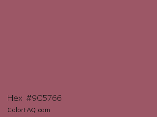 Hex #9c5766 Color is a normal red color and the nearest color is Rose Dust #9e5e6f. Hex code #9c5766 and RGB value is rgb(156,87,102). In RGB color space, this color is composed of 61% red, 34% green, 40% blue, In CMYK color space, this color is composed of 0% cyan, 44% magenta, 35% yellow , 39% black , In HSL color space, this color has a hue angle of 347° , 28% saturation and 48% lightness.