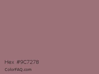 Hex #9c7278 Color is a normal red color and the nearest color is Bazaar #98777b. Hex code #9c7278 and RGB value is rgb(156,114,120). In RGB color space, this color is composed of 61% red, 45% green, 47% blue, In CMYK color space, this color is composed of 0% cyan, 27% magenta, 23% yellow , 39% black , In HSL color space, this color has a hue angle of 351° , 18% saturation and 53% lightness.