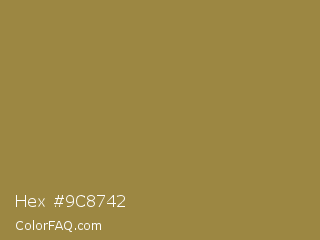 Hex #9c8742 Color is a normal yellow color and the nearest color is Metallic Sunburst #9c7c38. Hex code #9c8742 and RGB value is rgb(156,135,66). In RGB color space, this color is composed of 61% red, 53% green, 26% blue, In CMYK color space, this color is composed of 0% cyan, 13% magenta, 58% yellow , 39% black , In HSL color space, this color has a hue angle of 46° , 41% saturation and 44% lightness.