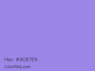 Hex #9c87e9 Color is a light indigo color and the nearest color is Dull Lavender #a899e6. Hex code #9c87e9 and RGB value is rgb(156,135,233). In RGB color space, this color is composed of 61% red, 53% green, 91% blue, In CMYK color space, this color is composed of 33% cyan, 42% magenta, 0% yellow , 9% black , In HSL color space, this color has a hue angle of 253° , 69% saturation and 72% lightness.