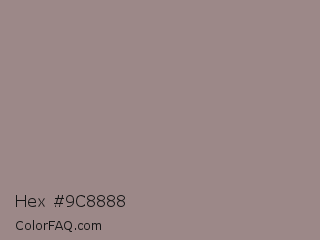 Hex #9c8888 Color is a normal red color and the nearest color is Venus #928590. Hex code #9c8888 and RGB value is rgb(156,136,136). In RGB color space, this color is composed of 61% red, 53% green, 53% blue, In CMYK color space, this color is composed of 0% cyan, 13% magenta, 13% yellow , 39% black , In HSL color space, this color has a hue angle of 0° , 9% saturation and 57% lightness.
