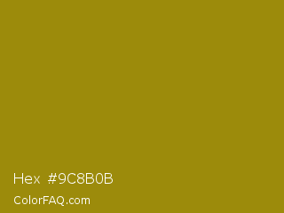 Hex #9c8b0b Color is a normal yellow color and the nearest color is Dark Yellow #9b870c. Hex code #9c8b0b and RGB value is rgb(156,139,11). In RGB color space, this color is composed of 61% red, 55% green, 4% blue, In CMYK color space, this color is composed of 0% cyan, 11% magenta, 93% yellow , 39% black , In HSL color space, this color has a hue angle of 53° , 87% saturation and 33% lightness.