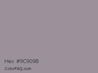 Hex #9c909b Color is a normal magenta color and the nearest color is Mountain Mist #959396. Hex code #9c909b and RGB value is rgb(156,144,155). In RGB color space, this color is composed of 61% red, 56% green, 61% blue, In CMYK color space, this color is composed of 0% cyan, 8% magenta, 1% yellow , 39% black , In HSL color space, this color has a hue angle of 305° , 6% saturation and 59% lightness.
