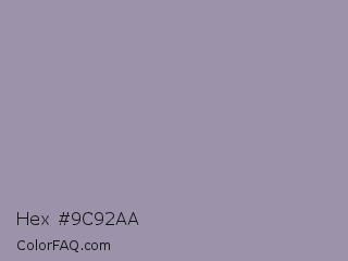 Hex #9c92aa Color is a light violet color and the nearest color is Manatee #979aaa. Hex code #9c92aa and RGB value is rgb(156,146,170). In RGB color space, this color is composed of 61% red, 57% green, 67% blue, In CMYK color space, this color is composed of 8% cyan, 14% magenta, 0% yellow , 33% black , In HSL color space, this color has a hue angle of 265° , 12% saturation and 62% lightness.