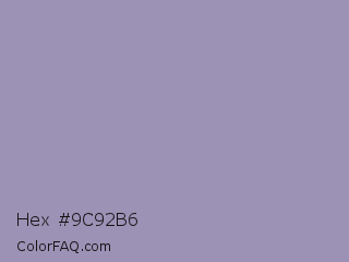 Hex #9c92b6 Color is a light indigo color and the nearest color is Amethyst Smoke #a397b4. Hex code #9c92b6 and RGB value is rgb(156,146,182). In RGB color space, this color is composed of 61% red, 57% green, 71% blue, In CMYK color space, this color is composed of 14% cyan, 20% magenta, 0% yellow , 29% black , In HSL color space, this color has a hue angle of 257° , 20% saturation and 64% lightness.