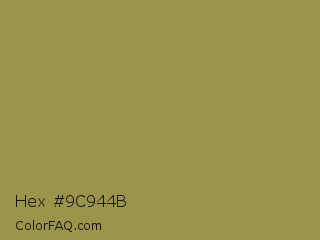 Hex #9c944b Color is a normal yellow color and the nearest color is Barley Corn #a68b5b. Hex code #9c944b and RGB value is rgb(156,148,75). In RGB color space, this color is composed of 61% red, 58% green, 29% blue, In CMYK color space, this color is composed of 0% cyan, 5% magenta, 52% yellow , 39% black , In HSL color space, this color has a hue angle of 54° , 35% saturation and 45% lightness.