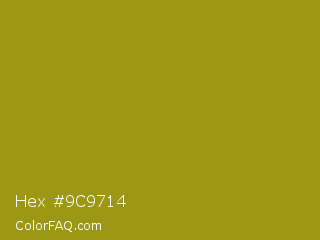 Hex #9c9714 Color is a normal yellow color and the nearest color is Dark Yellow #9b870c. Hex code #9c9714 and RGB value is rgb(156,151,20). In RGB color space, this color is composed of 61% red, 59% green, 8% blue, In CMYK color space, this color is composed of 0% cyan, 3% magenta, 87% yellow , 39% black , In HSL color space, this color has a hue angle of 58° , 77% saturation and 35% lightness.