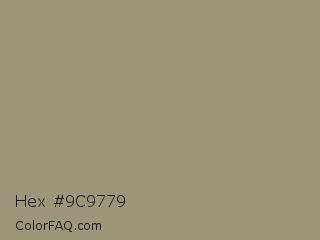 Hex #9c9779 Color is a normal yellow color and the nearest color is Gurkha #9a9577. Hex code #9c9779 and RGB value is rgb(156,151,121). In RGB color space, this color is composed of 61% red, 59% green, 47% blue, In CMYK color space, this color is composed of 0% cyan, 3% magenta, 22% yellow , 39% black , In HSL color space, this color has a hue angle of 51° , 15% saturation and 54% lightness.