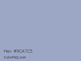 Hex #9ca7c5 Color is a light blue color and the nearest color is Rock Blue #9eb1cd. Hex code #9ca7c5 and RGB value is rgb(156,167,197). In RGB color space, this color is composed of 61% red, 65% green, 77% blue, In CMYK color space, this color is composed of 21% cyan, 15% magenta, 0% yellow , 23% black , In HSL color space, this color has a hue angle of 224° , 26% saturation and 69% lightness.