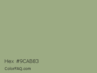 Hex #9cab83 Color is a normal green color and the nearest color is Sage #9ea587. Hex code #9cab83 and RGB value is rgb(156,171,131). In RGB color space, this color is composed of 61% red, 67% green, 51% blue, In CMYK color space, this color is composed of 9% cyan, 0% magenta, 23% yellow , 33% black , In HSL color space, this color has a hue angle of 83° , 19% saturation and 59% lightness.