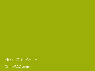 Hex #9caf08 Color is a normal yellow color and the nearest color is Apple Green #8db600. Hex code #9caf08 and RGB value is rgb(156,175,8). In RGB color space, this color is composed of 61% red, 69% green, 3% blue, In CMYK color space, this color is composed of 11% cyan, 0% magenta, 95% yellow , 31% black , In HSL color space, this color has a hue angle of 67° , 91% saturation and 36% lightness.