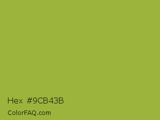 Hex #9cb43b Color is a normal lime color and the nearest color is Android Green #a4c639. Hex code #9cb43b and RGB value is rgb(156,180,59). In RGB color space, this color is composed of 61% red, 71% green, 23% blue, In CMYK color space, this color is composed of 13% cyan, 0% magenta, 67% yellow , 29% black , In HSL color space, this color has a hue angle of 72° , 51% saturation and 47% lightness.