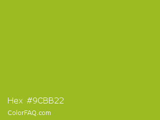 Hex #9cbb22 Color is a normal lime color and the nearest color is Citron #9fa91f. Hex code #9cbb22 and RGB value is rgb(156,187,34). In RGB color space, this color is composed of 61% red, 73% green, 13% blue, In CMYK color space, this color is composed of 17% cyan, 0% magenta, 82% yellow , 27% black , In HSL color space, this color has a hue angle of 72° , 69% saturation and 43% lightness.
