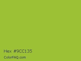 Hex #9cc135 Color is a normal lime color and the nearest color is Android Green #a4c639. Hex code #9cc135 and RGB value is rgb(156,193,53). In RGB color space, this color is composed of 61% red, 76% green, 21% blue, In CMYK color space, this color is composed of 19% cyan, 0% magenta, 73% yellow , 24% black , In HSL color space, this color has a hue angle of 76° , 57% saturation and 48% lightness.