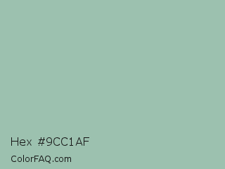 Hex #9cc1af Color is a light green color and the nearest color is Cambridge Blue #a3c1ad. Hex code #9cc1af and RGB value is rgb(156,193,175). In RGB color space, this color is composed of 61% red, 76% green, 69% blue, In CMYK color space, this color is composed of 19% cyan, 0% magenta, 9% yellow , 24% black , In HSL color space, this color has a hue angle of 151° , 23% saturation and 68% lightness.