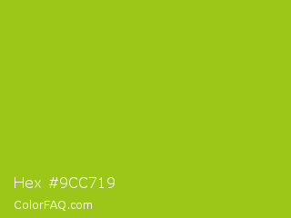 Hex #9cc719 Color is a normal lime color and the nearest color is Citrus #a1c50a. Hex code #9cc719 and RGB value is rgb(156,199,25). In RGB color space, this color is composed of 61% red, 78% green, 10% blue, In CMYK color space, this color is composed of 22% cyan, 0% magenta, 87% yellow , 22% black , In HSL color space, this color has a hue angle of 75° , 78% saturation and 44% lightness.