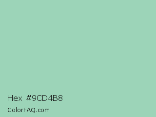 Hex #9cd4b8 Color is a light green color and the nearest color is Turquoise Green #a0d6b4. Hex code #9cd4b8 and RGB value is rgb(156,212,184). In RGB color space, this color is composed of 61% red, 83% green, 72% blue, In CMYK color space, this color is composed of 26% cyan, 0% magenta, 13% yellow , 17% black , In HSL color space, this color has a hue angle of 150° , 39% saturation and 72% lightness.