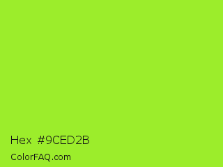 Hex #9ced2b Color is a normal green color and the nearest color is Green Lizard #a7f432. Hex code #9ced2b and RGB value is rgb(156,237,43). In RGB color space, this color is composed of 61% red, 93% green, 17% blue, In CMYK color space, this color is composed of 34% cyan, 0% magenta, 82% yellow , 7% black , In HSL color space, this color has a hue angle of 85° , 84% saturation and 55% lightness.