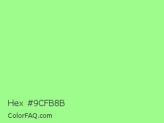 Hex #9cfb8b Color is a light green color and the nearest color is Pale Green #98fb98. Hex code #9cfb8b and RGB value is rgb(156,251,139). In RGB color space, this color is composed of 61% red, 98% green, 55% blue, In CMYK color space, this color is composed of 38% cyan, 0% magenta, 45% yellow , 2% black , In HSL color space, this color has a hue angle of 111° , 93% saturation and 76% lightness.