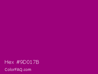 Hex #9d017b Color is a normal magenta color and the nearest color is Flirt #a2006d. Hex code #9d017b and RGB value is rgb(157,1,123). In RGB color space, this color is composed of 62% red, 0% green, 48% blue, In CMYK color space, this color is composed of 0% cyan, 99% magenta, 22% yellow , 38% black , In HSL color space, this color has a hue angle of 313° , 99% saturation and 31% lightness.
