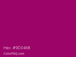 Hex #9d0468 Color is a normal magenta color and the nearest color is Fresh Eggplant #990066. Hex code #9d0468 and RGB value is rgb(157,4,104). In RGB color space, this color is composed of 62% red, 2% green, 41% blue, In CMYK color space, this color is composed of 0% cyan, 97% magenta, 34% yellow , 38% black , In HSL color space, this color has a hue angle of 321° , 95% saturation and 32% lightness.