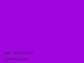 Hex #9d07dd Color is a normal purple color and the nearest color is Dark Violet #9400d3. Hex code #9d07dd and RGB value is rgb(157,7,221). In RGB color space, this color is composed of 62% red, 3% green, 87% blue, In CMYK color space, this color is composed of 29% cyan, 97% magenta, 0% yellow , 13% black , In HSL color space, this color has a hue angle of 282° , 94% saturation and 45% lightness.