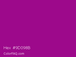 Hex #9d098b Color is a normal magenta color and the nearest color is Violet Eggplant #991199. Hex code #9d098b and RGB value is rgb(157,9,139). In RGB color space, this color is composed of 62% red, 4% green, 55% blue, In CMYK color space, this color is composed of 0% cyan, 94% magenta, 11% yellow , 38% black , In HSL color space, this color has a hue angle of 307° , 89% saturation and 33% lightness.