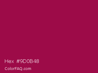 Hex #9d0b48 Color is a normal rose color and the nearest color is Pink Raspberry #980036. Hex code #9d0b48 and RGB value is rgb(157,11,72). In RGB color space, this color is composed of 62% red, 4% green, 28% blue, In CMYK color space, this color is composed of 0% cyan, 93% magenta, 54% yellow , 38% black , In HSL color space, this color has a hue angle of 335° , 87% saturation and 33% lightness.