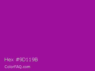 Hex #9d119b Color is a normal magenta color and the nearest color is Violet Eggplant #991199. Hex code #9d119b and RGB value is rgb(157,17,155). In RGB color space, this color is composed of 62% red, 7% green, 61% blue, In CMYK color space, this color is composed of 0% cyan, 89% magenta, 1% yellow , 38% black , In HSL color space, this color has a hue angle of 301° , 80% saturation and 34% lightness.