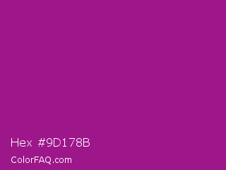 Hex #9d178b Color is a normal magenta color and the nearest color is Violet Eggplant #991199. Hex code #9d178b and RGB value is rgb(157,23,139). In RGB color space, this color is composed of 62% red, 9% green, 55% blue, In CMYK color space, this color is composed of 0% cyan, 85% magenta, 11% yellow , 38% black , In HSL color space, this color has a hue angle of 308° , 74% saturation and 35% lightness.