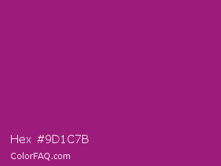 Hex #9d1c7b Color is a normal magenta color and the nearest color is Amaranth Deep Purple #9f2b68. Hex code #9d1c7b and RGB value is rgb(157,28,123). In RGB color space, this color is composed of 62% red, 11% green, 48% blue, In CMYK color space, this color is composed of 0% cyan, 82% magenta, 22% yellow , 38% black , In HSL color space, this color has a hue angle of 316° , 70% saturation and 36% lightness.